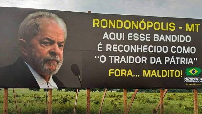 O outdoor foi ‘inaugurado’ por movimentos conservadores de Rondonópolis (MT), hoje. Na mensagem da peça publicitária, o ex-presidente Luiz Inácio Lula da Silva (PT) é chamado de bandido e traidor.