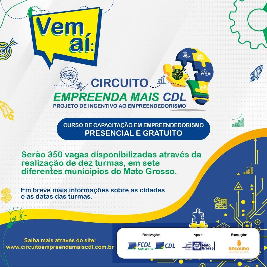 Estão abertas as inscrições para a primeira turma do Projeto Circuito Empreenda Mais CDL VG. As aulas ocorrerão no município de Várzea Grande, de 27/02 a 03/03 no turno da noite, das 18h30min às 21h30min. Os encontros serão presenciais na própria CDL de Várzea Grande, endereço Rua Miguel Leite, 252 - Centro Norte.