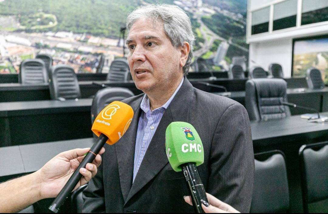 A foto mostra o secretário de Planejamento, Nivaldo Carvalho, vestido com traje social, concedendo entrevista a veículos de comunicação. O ambiente é o plenário da Câmara Municipal de Cuiabá. Ao fundo, é possível visualizar mesas pretas e cadeiras estofadas na cor preta.
